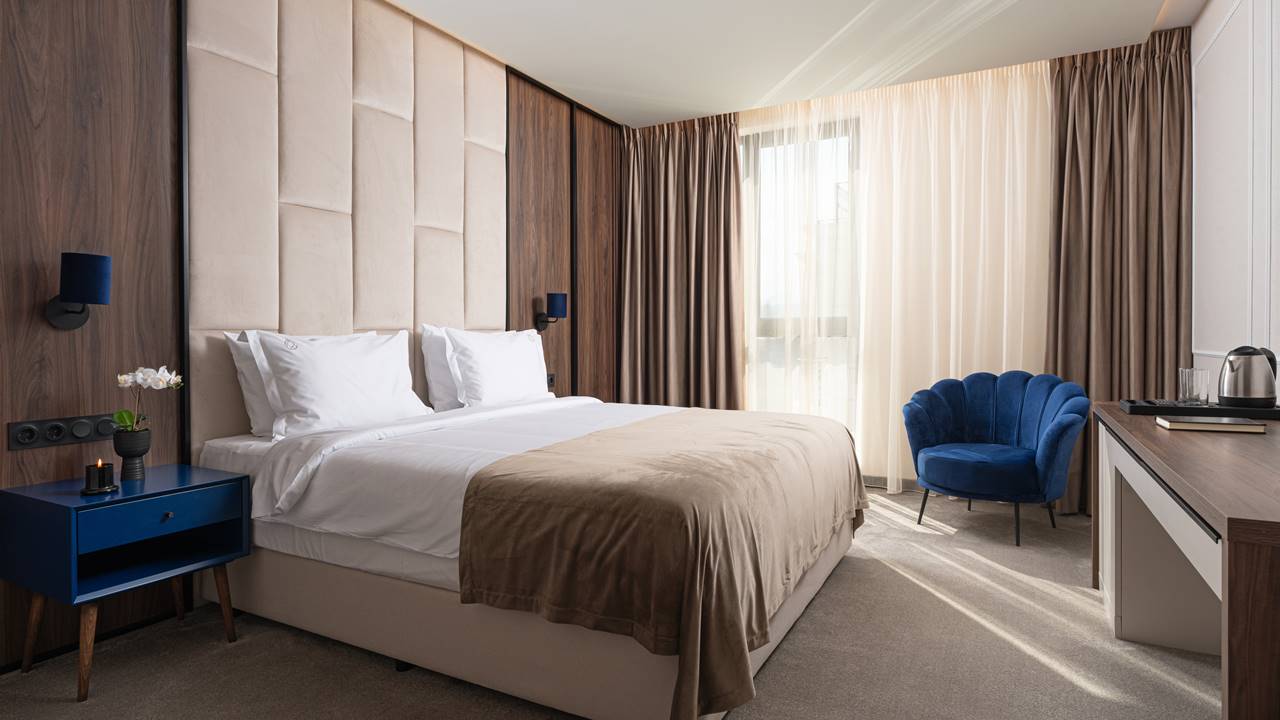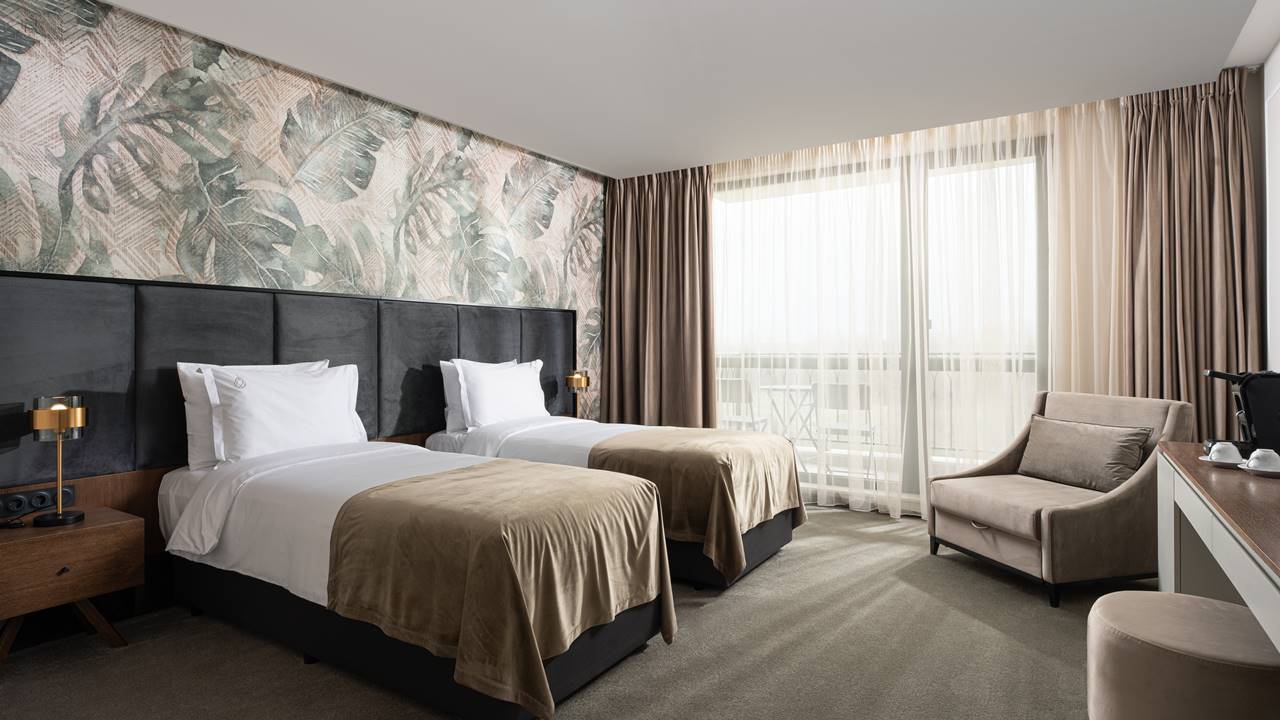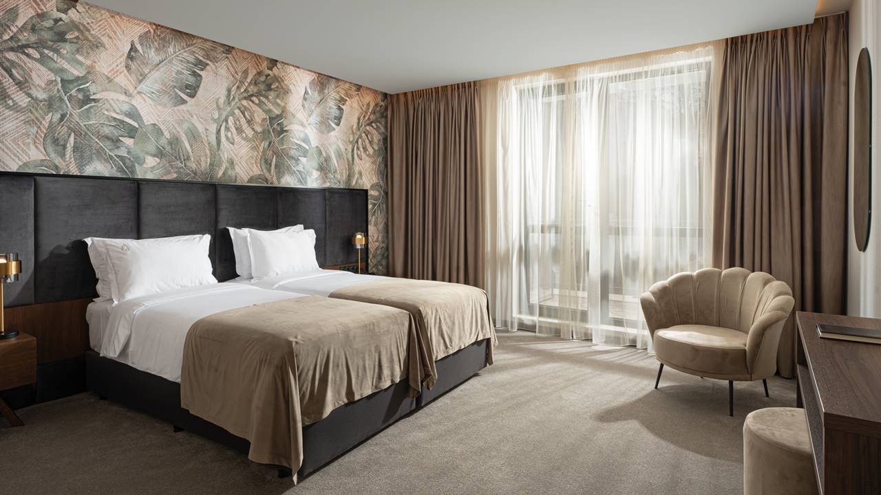 - двойна стая стандарт - Стандартните стаи са с площ около 24-26 кв.м. и разполагат със спалня (180/200), разтегателен фотьойл, баня с душ кабина, телевизор, хладилник, кана за вода, балкон и др. Комфорт, елегантност и функционалност с усещане за спокойствие. Идеална е за вашия пълноценен престой.