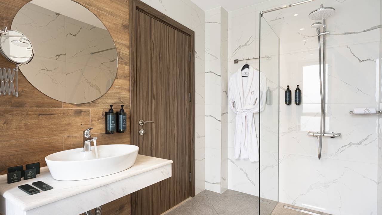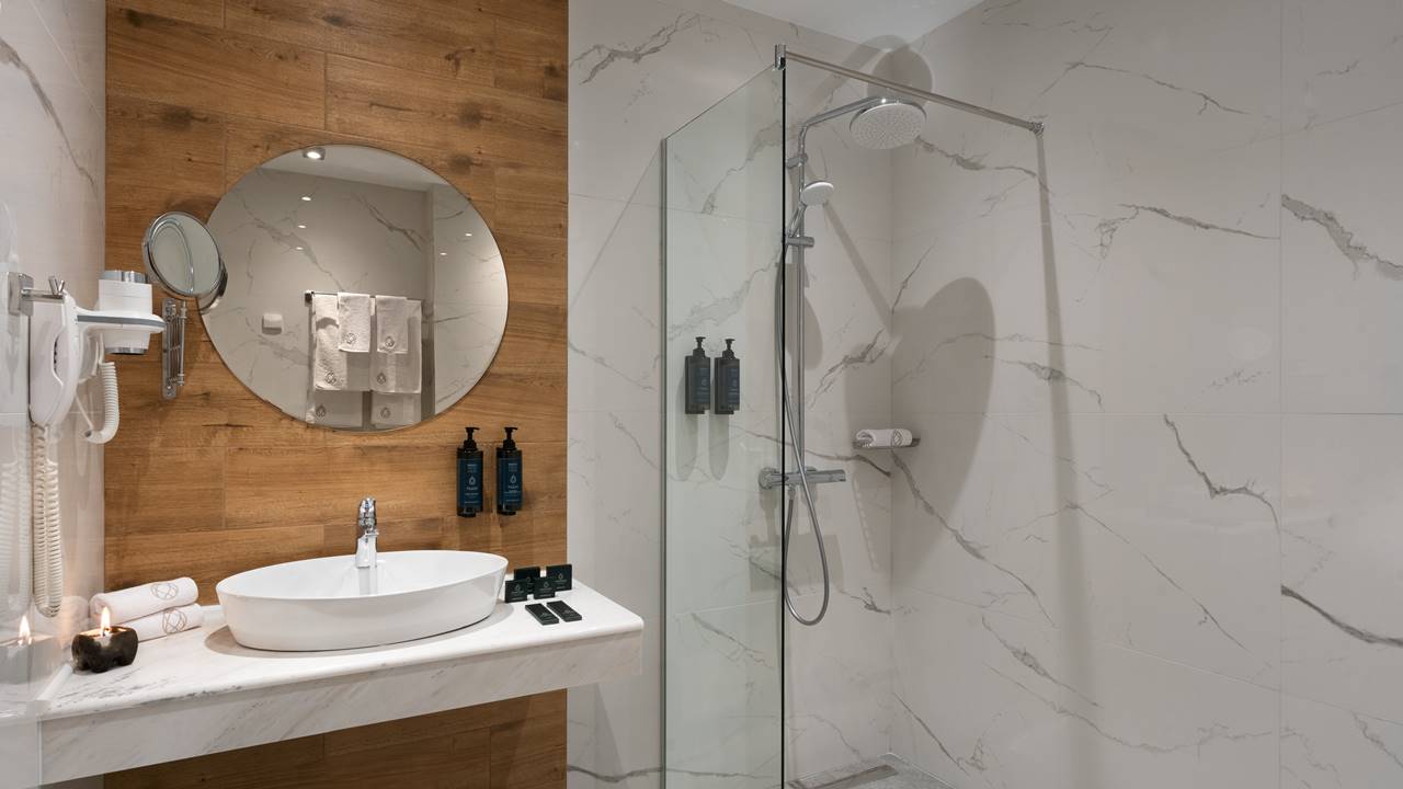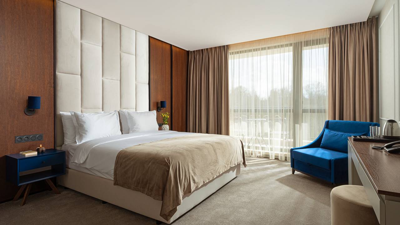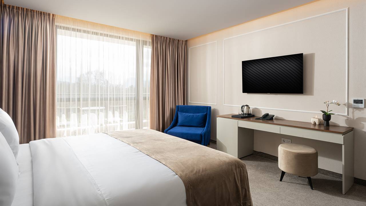 - двойна стая стандарт - Стандартните стаи са с площ около 24-26 кв.м. и разполагат със спалня (180/200), разтегателен фотьойл, баня с душ кабина, телевизор, хладилник, кана за вода, балкон и др. Комфорт, елегантност и функционалност с усещане за спокойствие. Идеална е за вашия пълноценен престой.