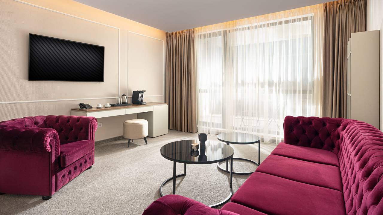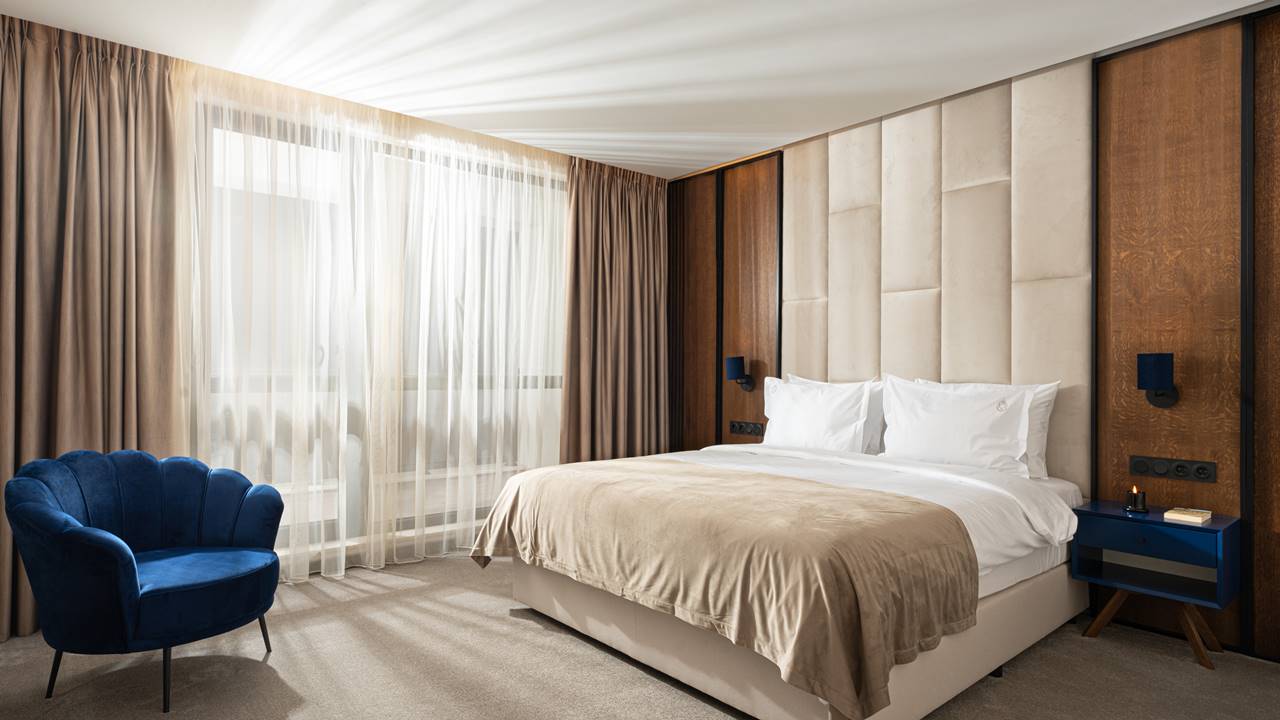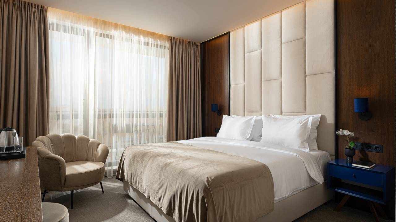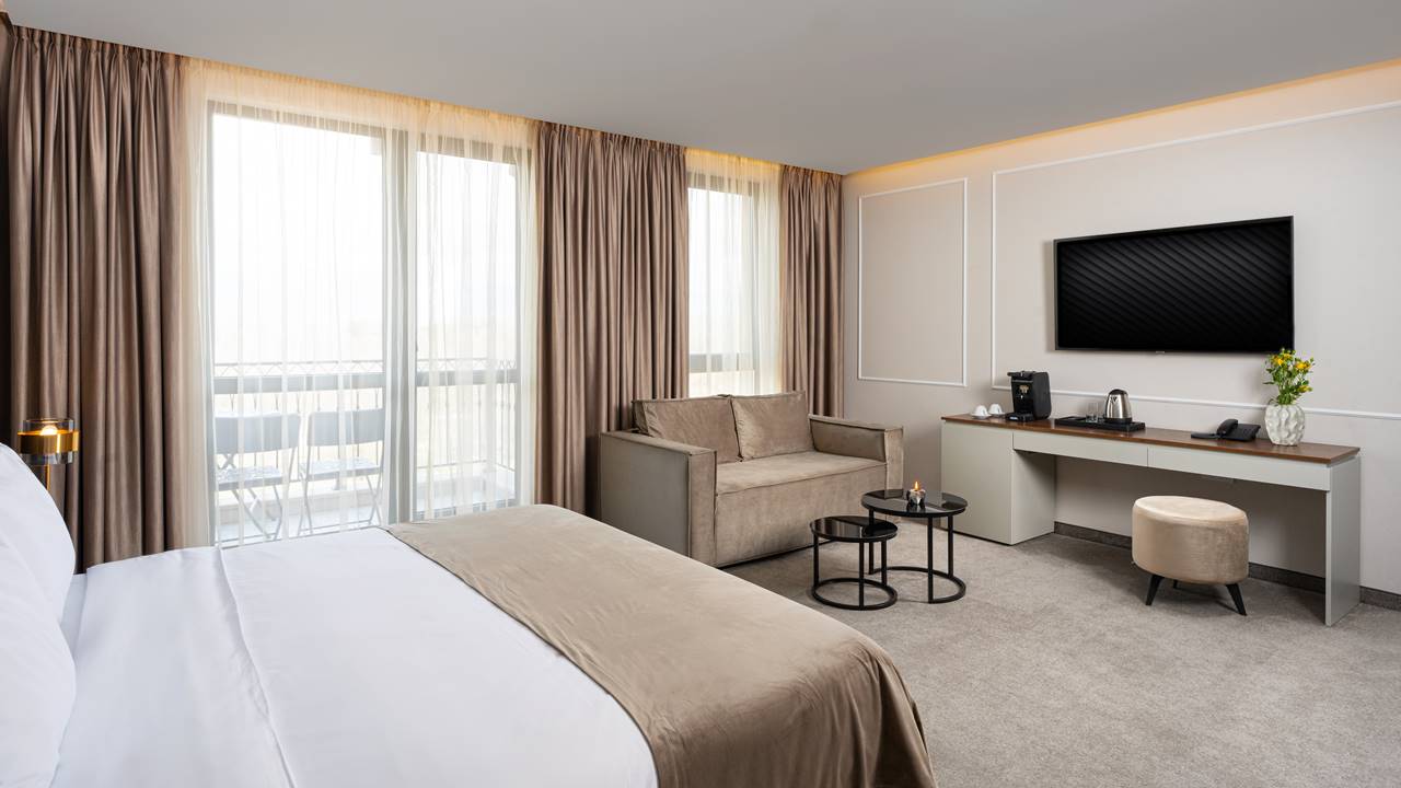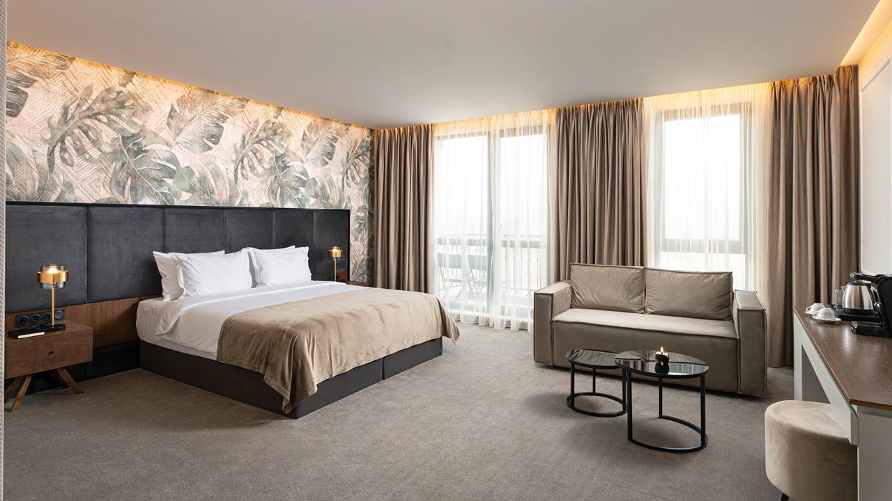 - двойна стая делукс - Гранд Делукс стаите са с площ около 38 кв.м. и разполагат със спалня (180/200) или 2 единични легла, разтегателен фотьойл, баня с душ кабина, телевизор, хладилник, кана за вода, кафе машина, балкон и др. Удобство и простор – тези стаи са перфектна комбинация както за двойка, така и за семейство с деца. Достатъчно големи и оборудвани с всичко необходимо за вашия комфорт.