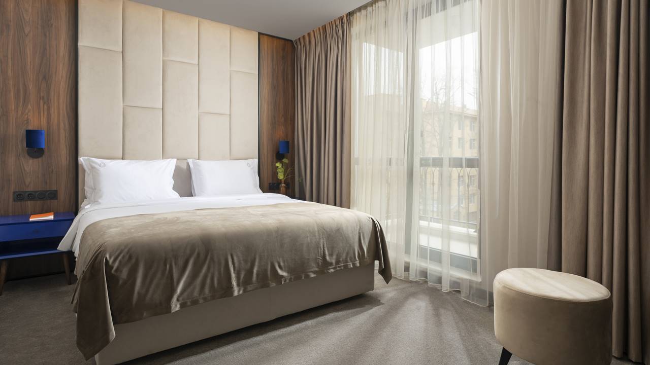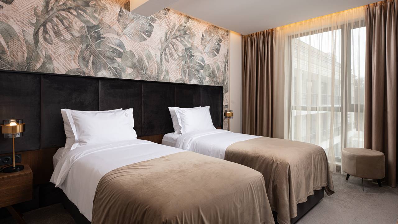 - икономична двойна стая - Икономичните стаи са с площ около 21-23 кв.м. и разполагат със спалня (180/200), душ кабина, телевизор, хладилник, кана за вода и др. Естествените и меки цветове, минималистичният и модерен интериор и удобните мебели са съчетани в перфектен баланс за вашия пълноценен релакс. Икономичните стаи не разполагат с балкони