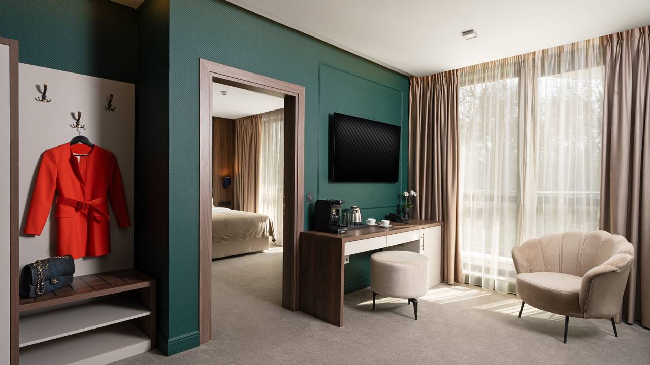 - апартамент с 1 спалня - Апартаментите са с площ около 33 - 48 кв.м. и разполагат със спалня (180/200) или 2 единични легла, хол с разтегателен диван, баня с душ кабина или вана, телевизор, хладилник, кана за вода, кафе машина, балкон и др. Едноспалните апартаменти ще ви осигурят уют и комфорт. Тук ще Ви посрещнат топли цветове и материи. Отделени с плътна врата спалнята и всекидневната са перфектни за уединение по време на семейната Ви почивка.