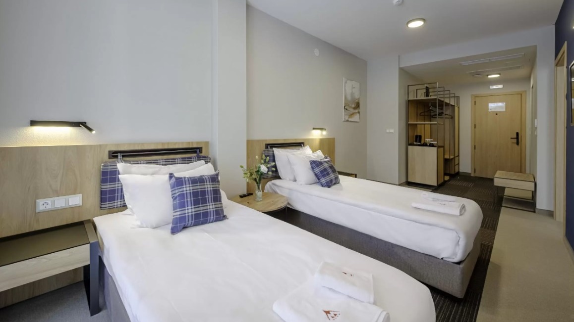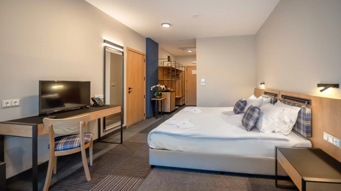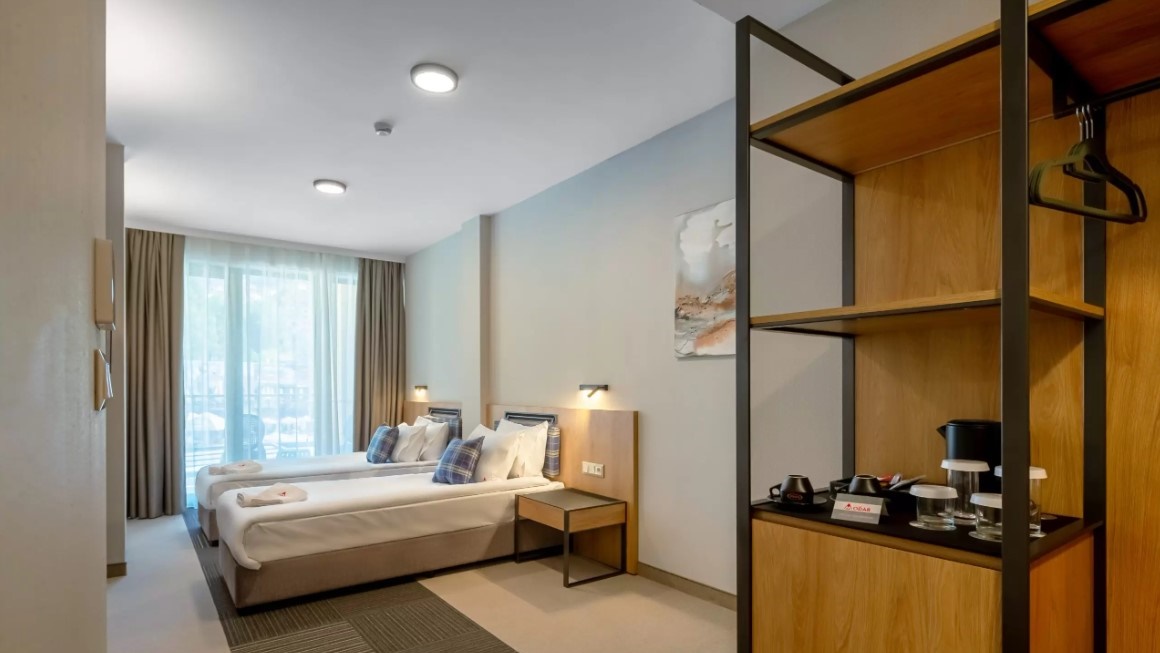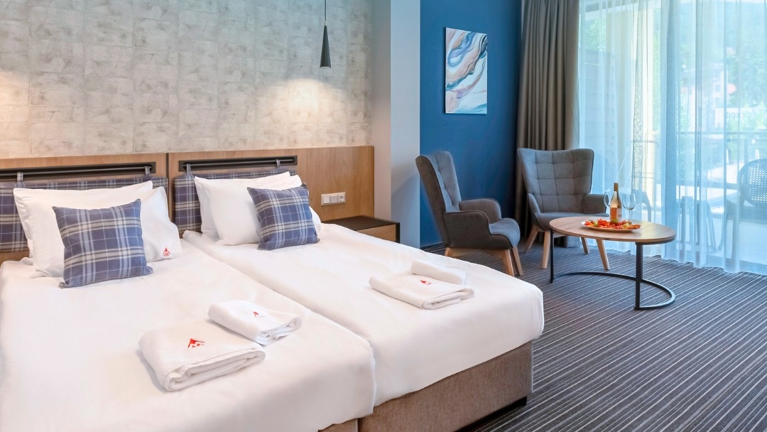 - двойна стая делукс - 2 единични легла и разтегателен фотьойл, тераса, климатик, сейф, бюро, електрическа кана, кафе /чай, гардероб, телевизор, баня с душ и сешоар