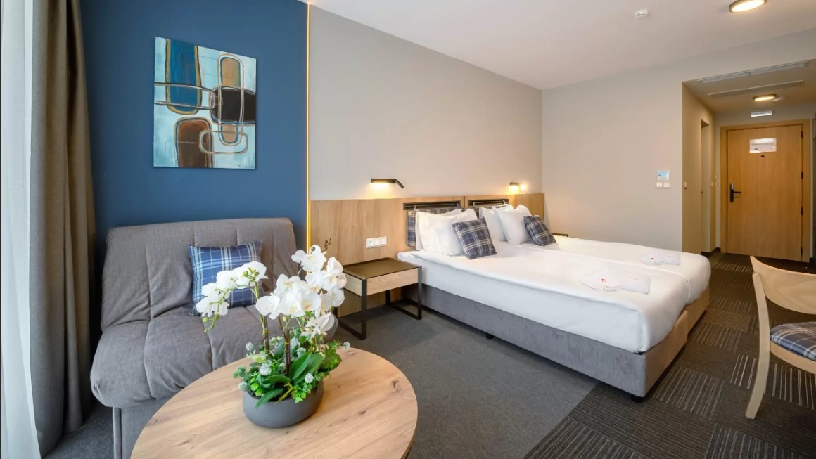 - апартамент с 1 спалня - разполага със спалня с двойно легло и дневна с разтегателен двоен диван, климатик, сейф, бюро, електрическа кана, кафе /чай, гардероб, телевизор, баня с душ и сешоар, балкон