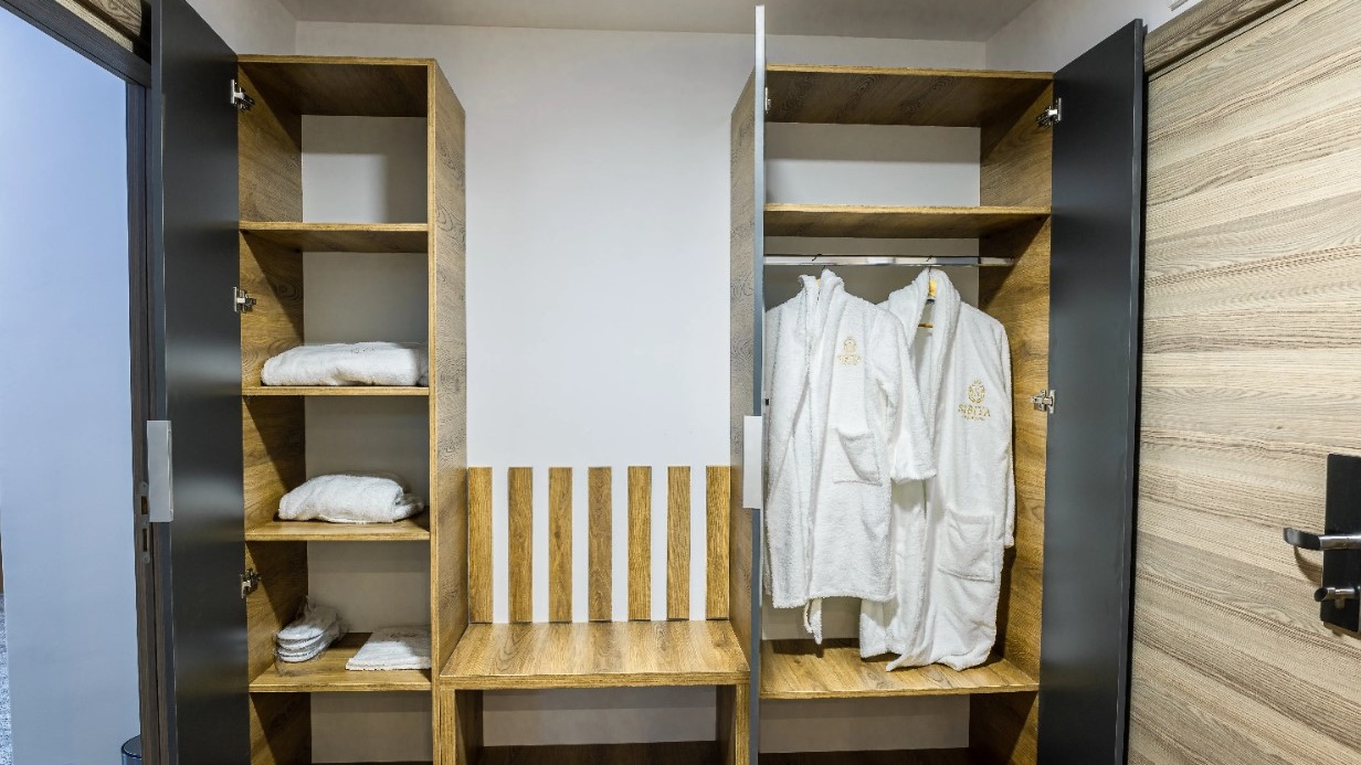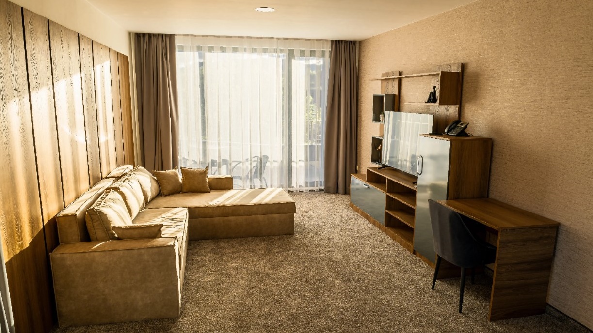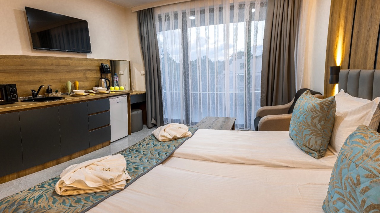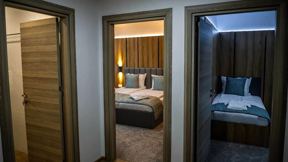• Двустаен Фамилен апартамент - В първата стая има "King Size" легло, 45" инчов Smart TV, удобен фотьойл с маса, вграден климатик, минибар, гардеробна, blackout завеси, ютия (по заявка от рецепция), шумоизолация. Втората стая разполага с 2 броя eдинични легла по 120x200, вграден климатик, гардероб, цветно LED осветление, blackout щори, шумоизолация и голяма тераса с гледка гора и външен кът за сядане, в банята има професионален сешоар, огледало с LED осветление и нагревател за размъгляване, функционална душ кабина, комплект - плажна хавлия, кърпа, халат и чехли (на човек),  козметика за баня, сушилник