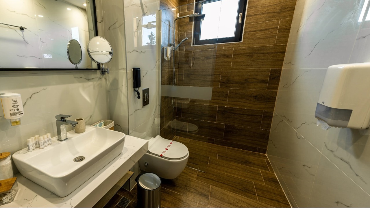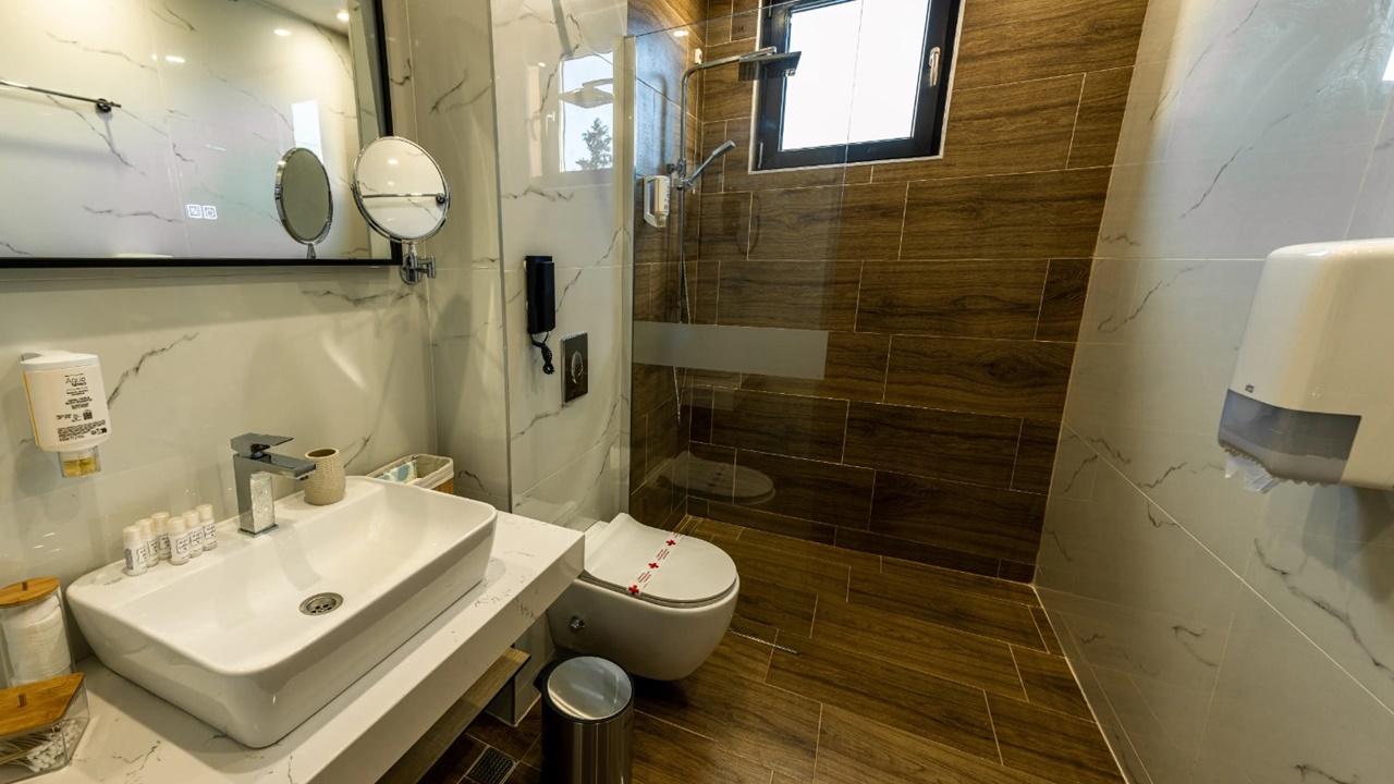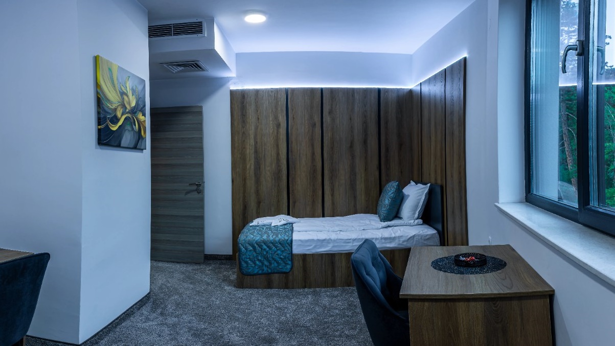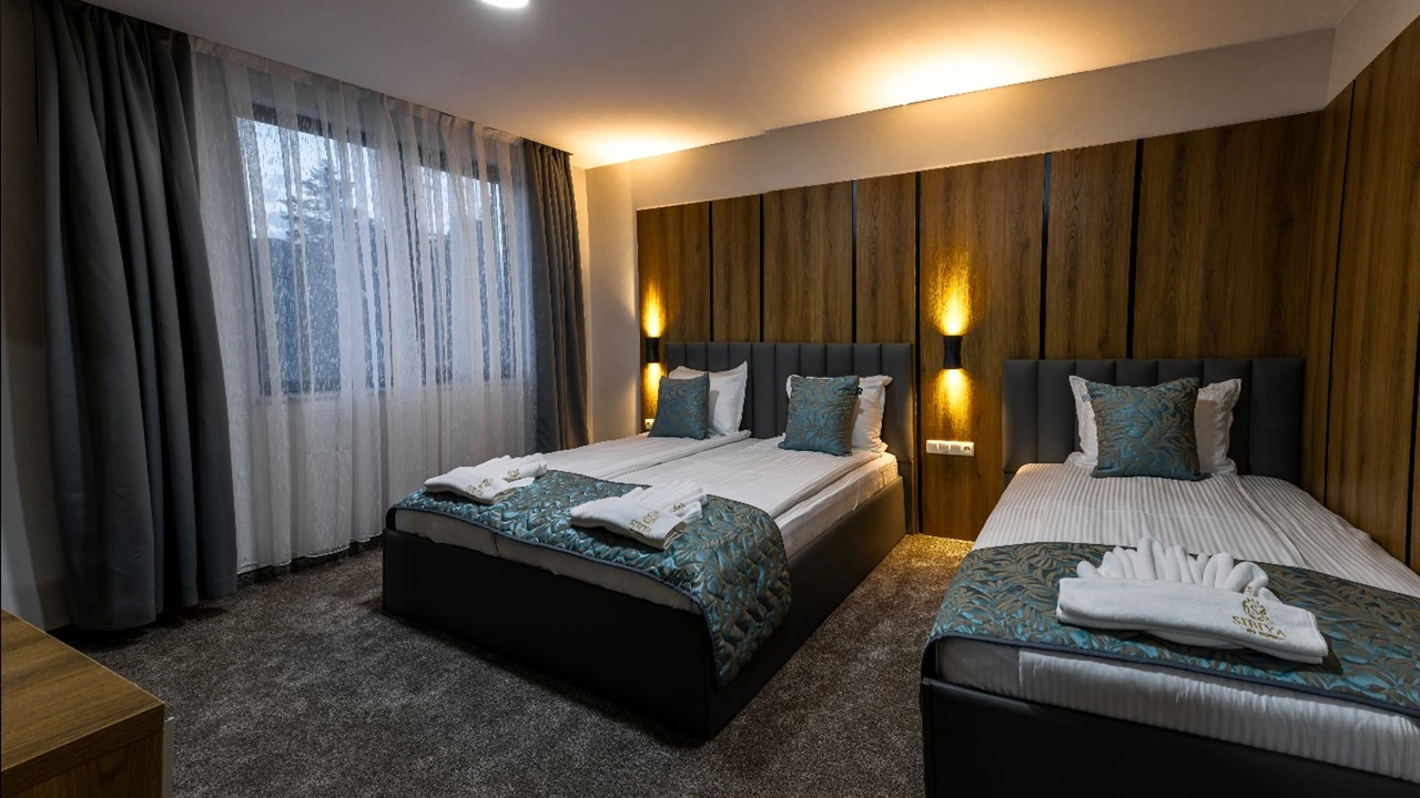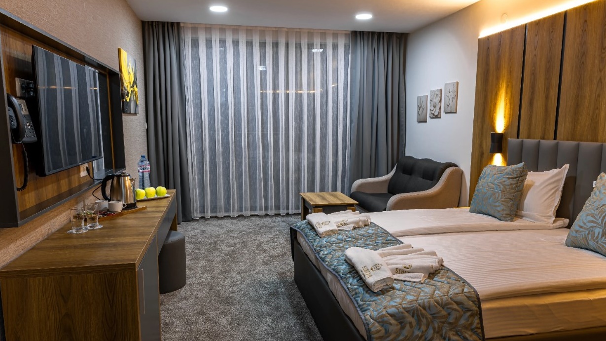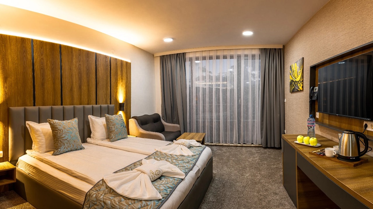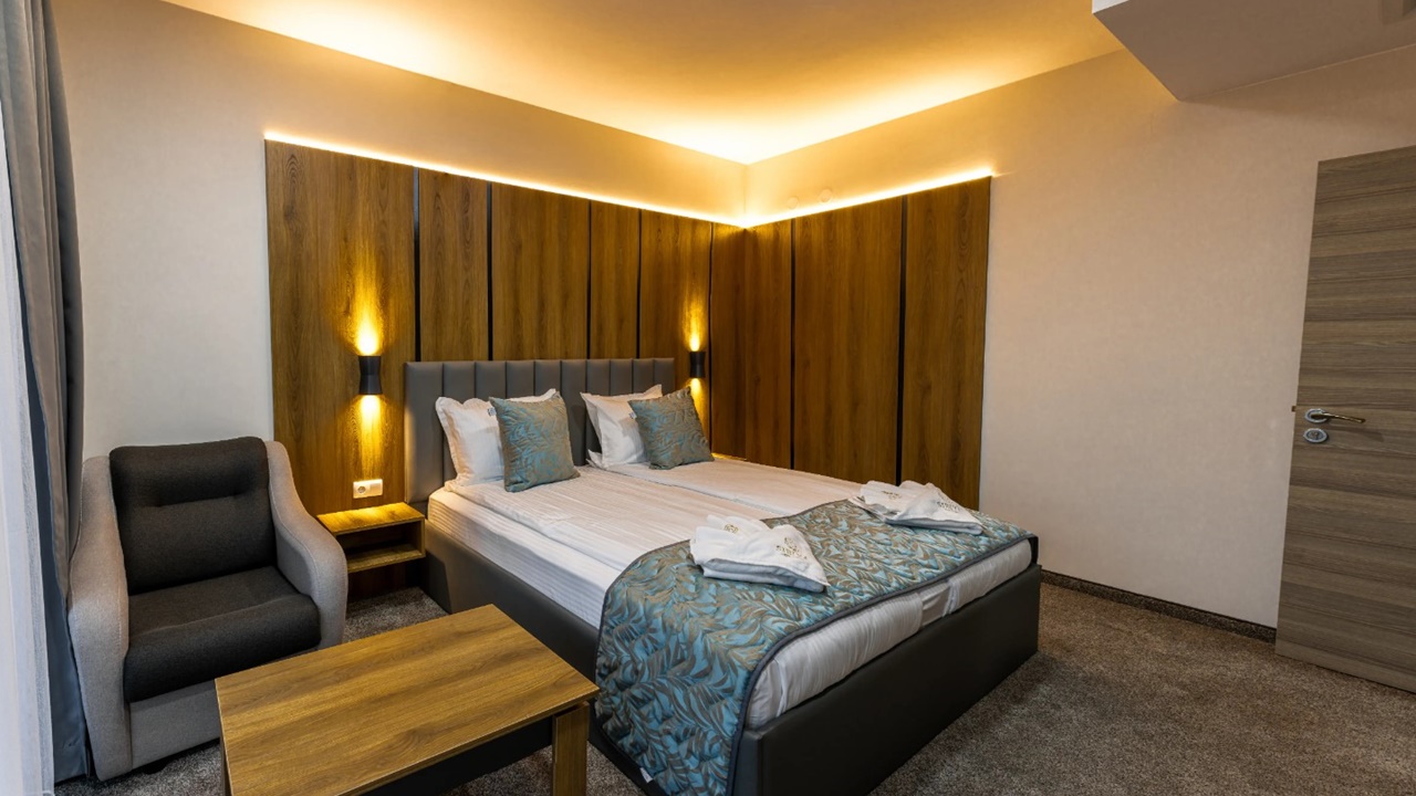 • двойна стая делукс - Разполага с "King Size" легло, разтегателен диван, 45" инчов Smart TV, вътрешен кът за сядане, вграден климатик, минибар, гардеробна, blackout завеси, ютия (по заявка от рецепция), шумоизолация, професионален сешоар, огледало с LED осветление и нагревател за размъгляване, функционална душ кабина, комплект - плажна хавлия, кърпа, халат и чехли (на човек),  козметика за баня, сушилник, тераса с гледка към гора или басейн, външен кът за сядане