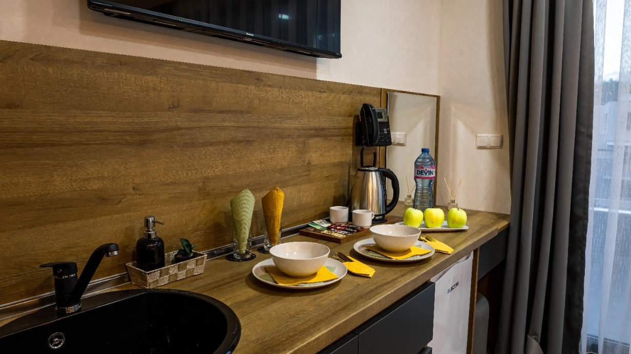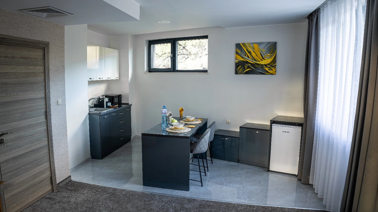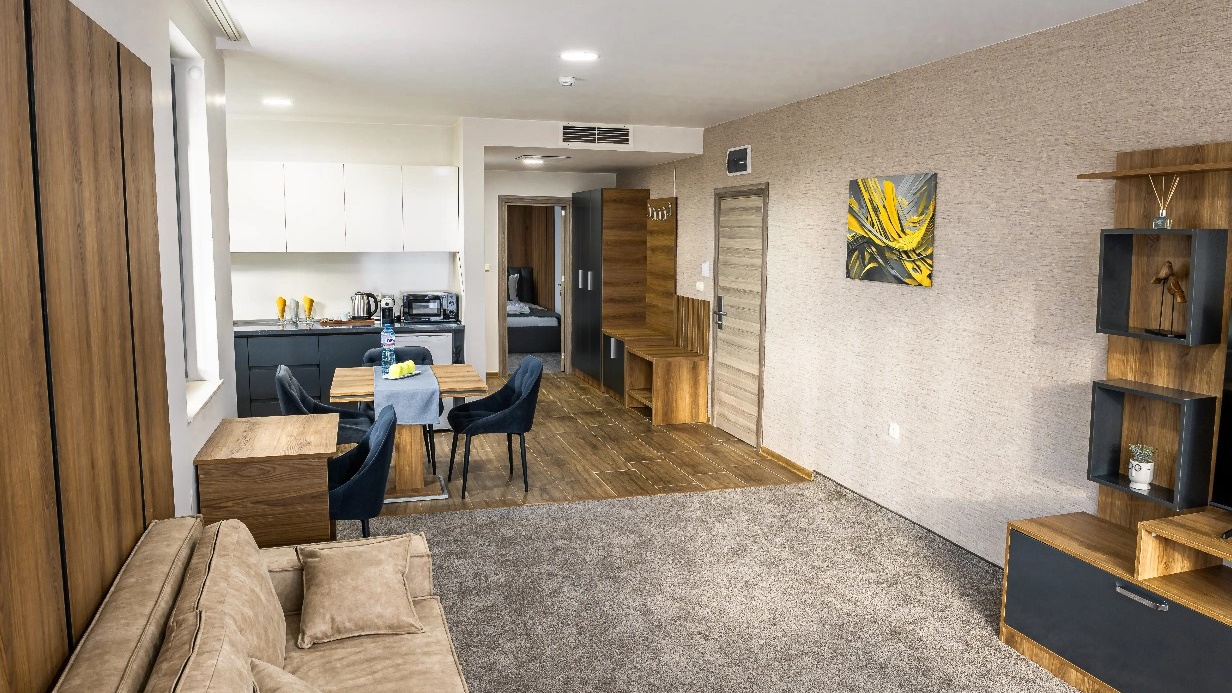 • Панорамен Апартамент (Panorama Suite) - спалня и хол с кухня -  с "King Size" спалня (186x206), Втора "King Size" спалня или Разтегателен диван, 45" инчов Smart TV, Вътрешен кът за сядане, телефон, вграден климатик, минибар, гардеробна, blackout завеси, ютия (по заявка от рецепция), шумоизолация; вътрешна кухня, вътрешен бар, голям кът за сядане с 2 броя удобни (разтегателни) дивана, 55" инчов Smart TV, вграден климатик, минибар, външна гардеробна, blackout завеси, ютия (по заявка от рецепция), шумоизолация, панорамна тераса с гледка към Огняново, Родопи и Пирин (гледка към гора и басейн) и голям външен кът за сядане,  в банята има професионален сешоар, огледало с LED осветление и нагревател за размъгляване, функционална душ кабина, комплект - плажна хавлия, кърпа, халат и чехли (на човек),  козметика за баня, сушилник