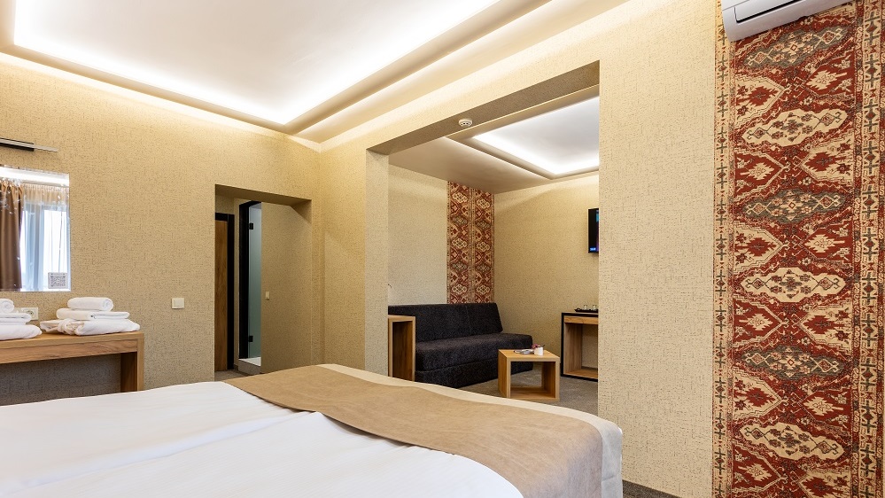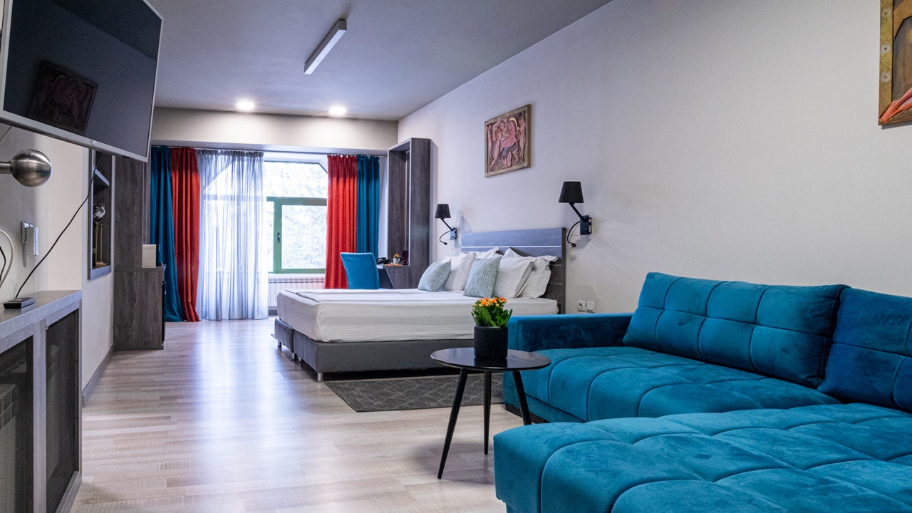 • Студио Делукс - Студио делукс е перлата на изцяло новия пети етаж на хотела. Невероятен комфорт и лукс, панорамни гледки, които спират дъха. Просторни бани . Предлага се изглед към града или зелена борова гора.