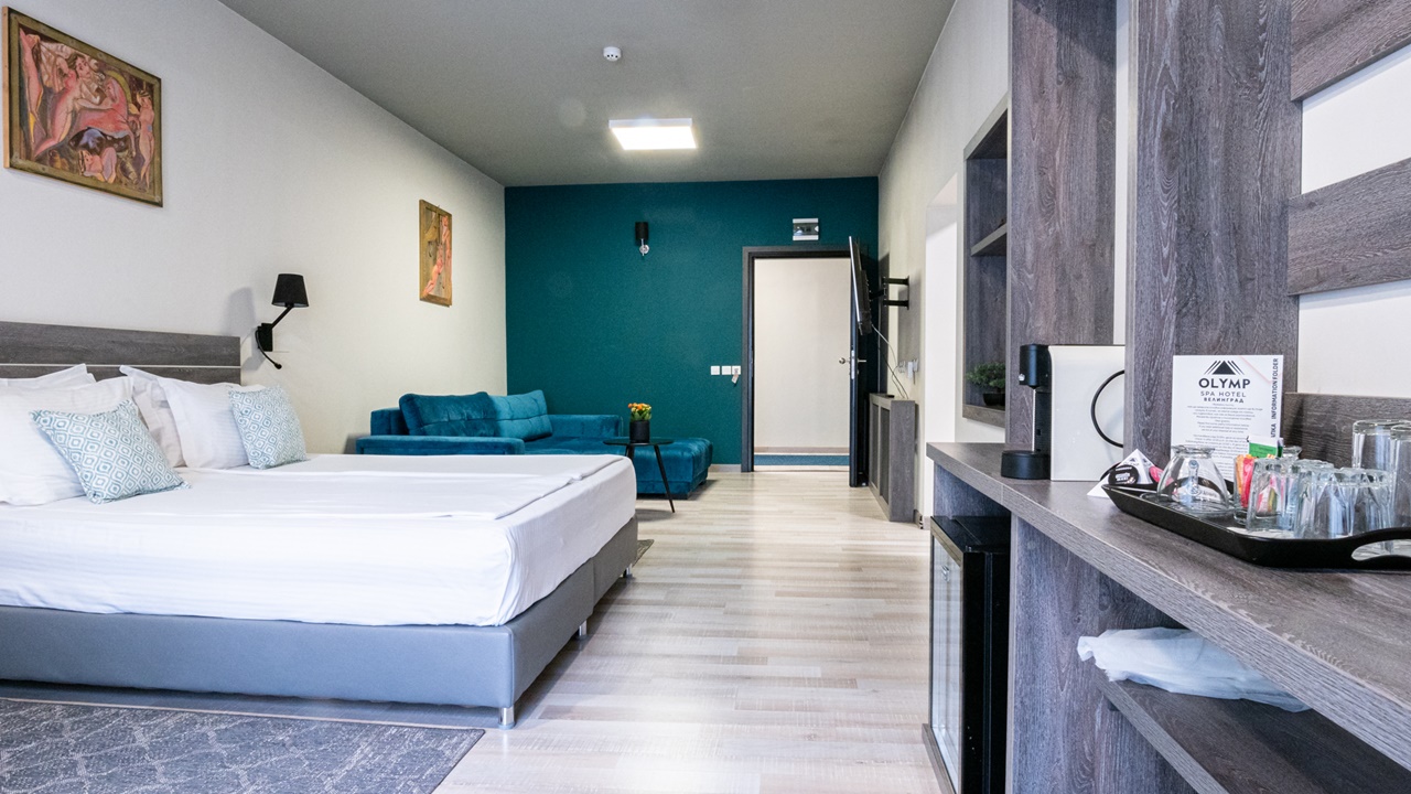 Спа Хотел Олимп, Велинград разполага с напълно реновирани двойни стаи, студиа и апартаменти, както и луксозно ВИП крило на последния етаж, където ще откриете стилен интериор, модерни удобства и уединение. Всички помещения са оборудвани с телевизори, безплатен високоскоростен Wi-Fi, а от прозорците се открива красива панорама – към вечнозелената гора или към столицата на минералната вода - Велинград.
