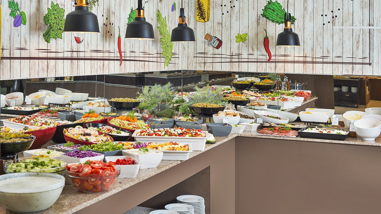 • Вечеря (18:00 - 21:00 ч.) в Основен ресторант в Сграда 2 - интернационален бюфет, салатен бар, шоу кукинг, карвинг, супи, разнообразие от десерти и плодове, тематичен кът, десерти и сладолед в Кафе-Сладкарницата, напитки от секцията за самообслужване в ресторанта.