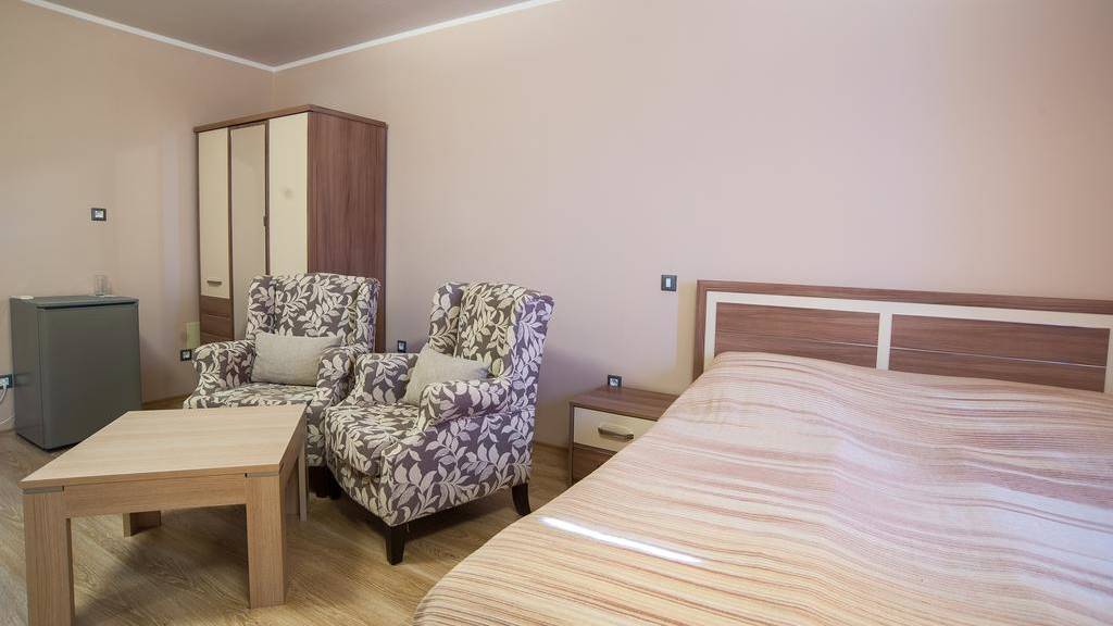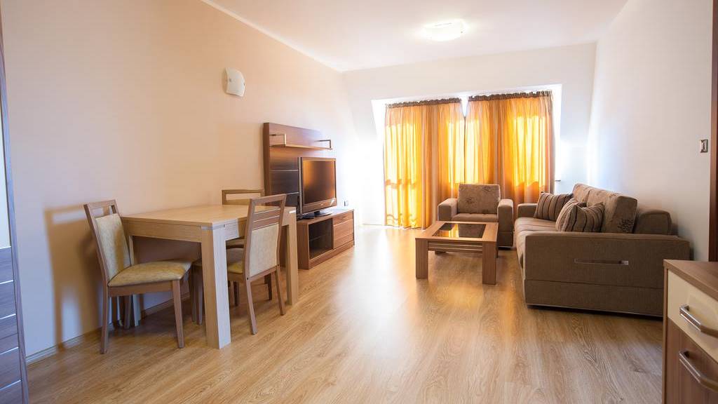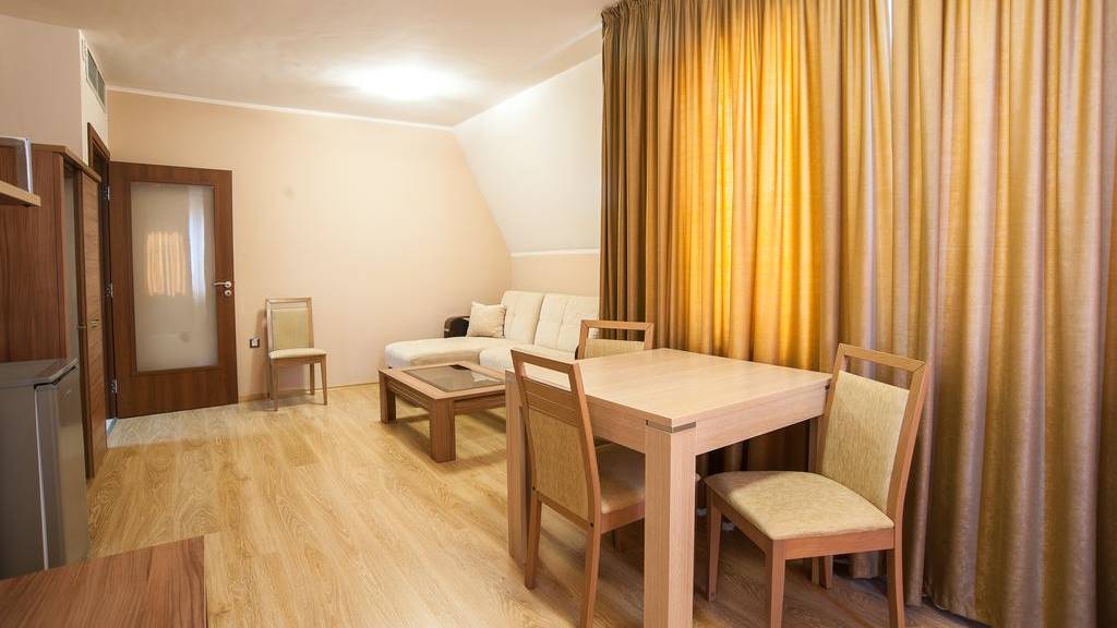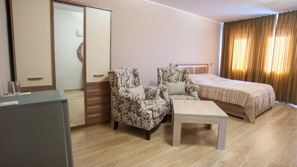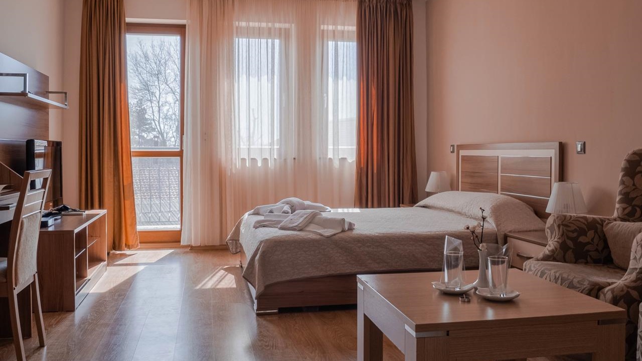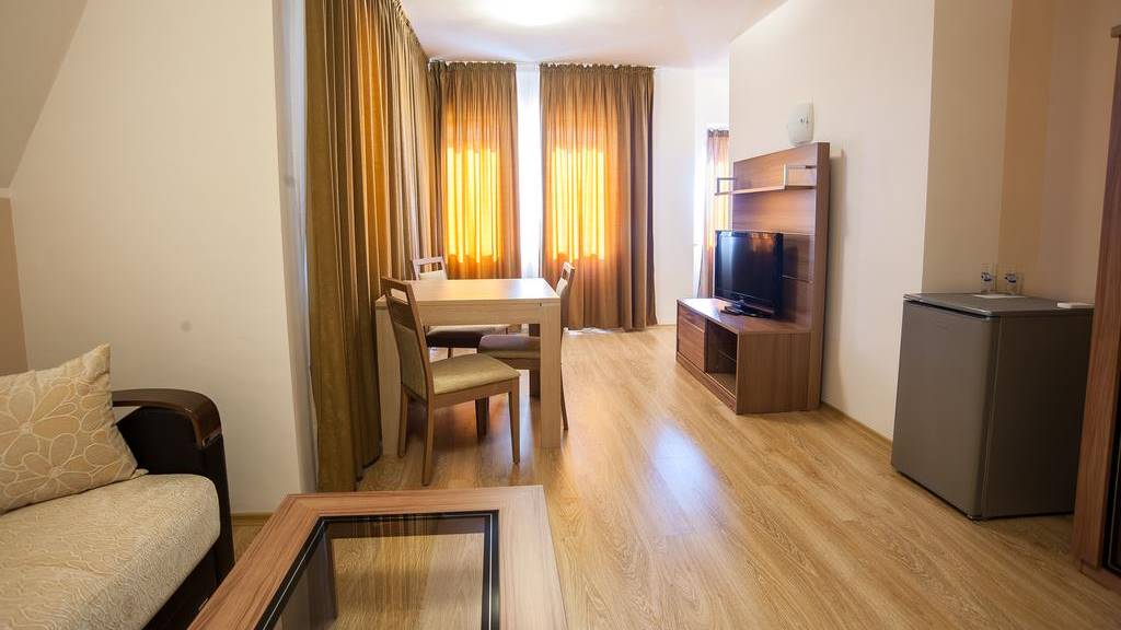 - суит без балкон - Суитите са с площ около 60 кв.м. и всички разполагат със спалня, разтегателен диван, климатик, мини хладилник, телевизор с плосък екран с кабелна телевизия, сешоар, кана за вода, тоалетни принадлежности, вана