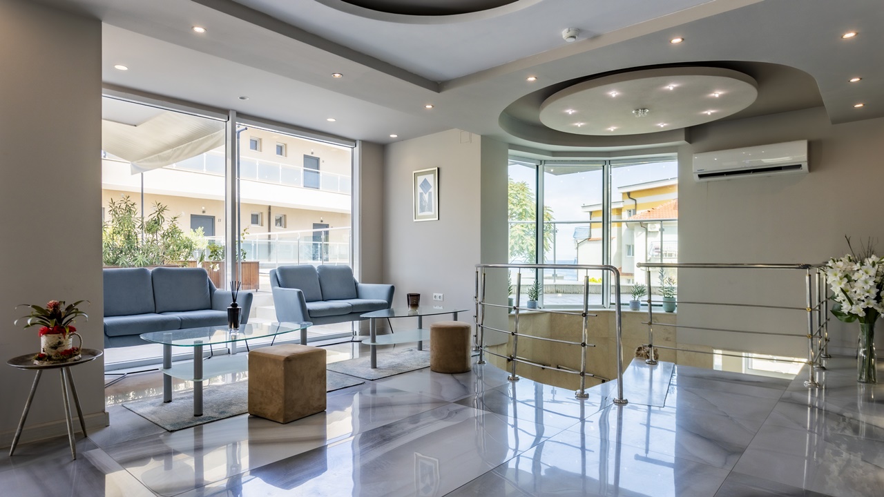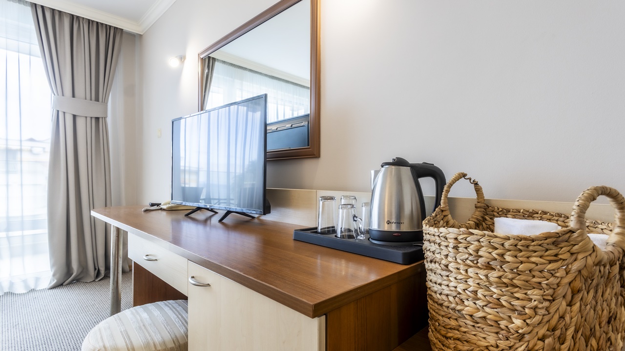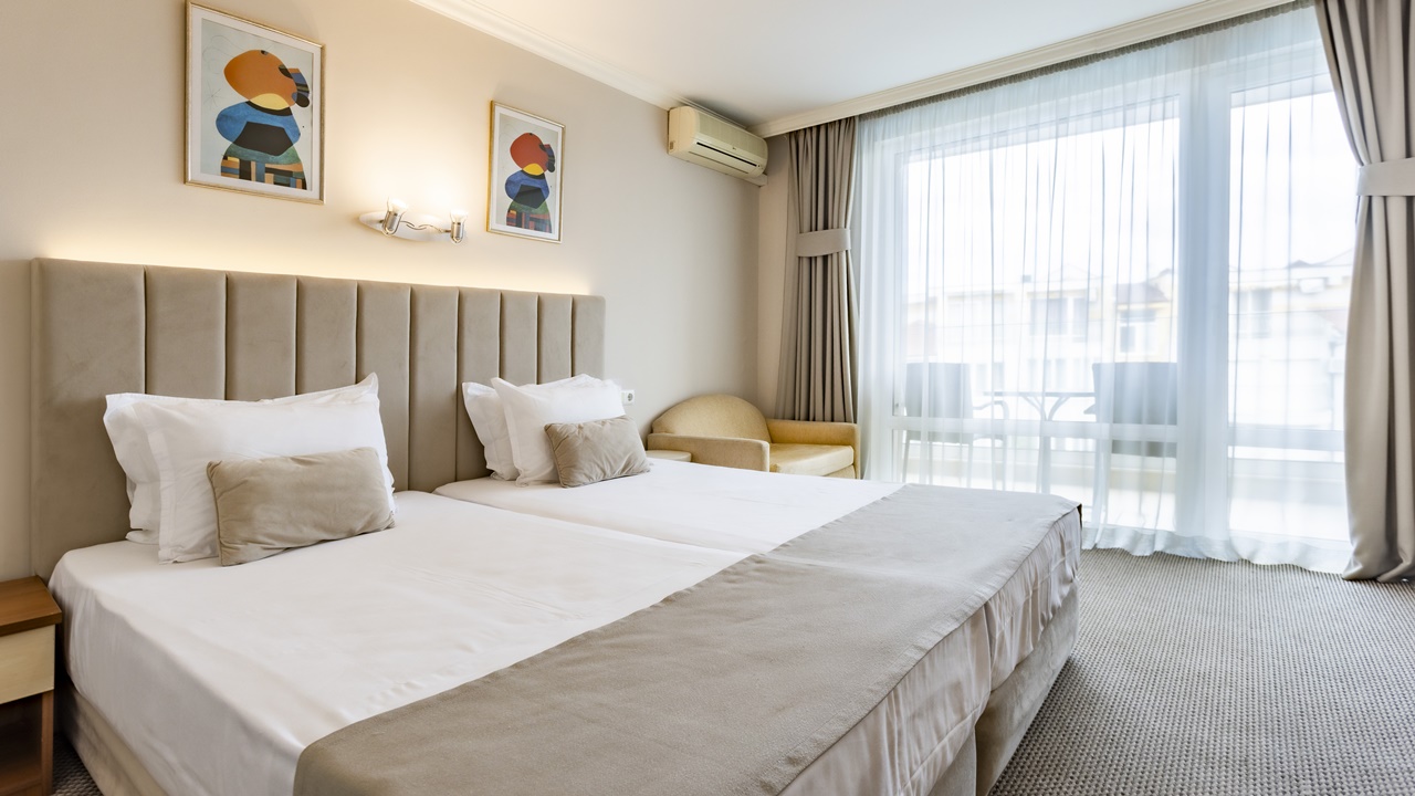 - Хотелът разполага с 40 стаи и 6 апартамента - всички оборудвани с баня, климатик, кабелна телевизия, мини бар, телефон и тераса