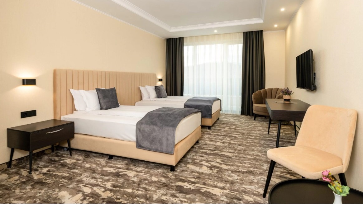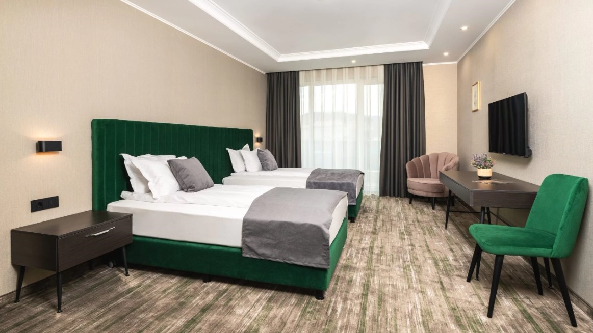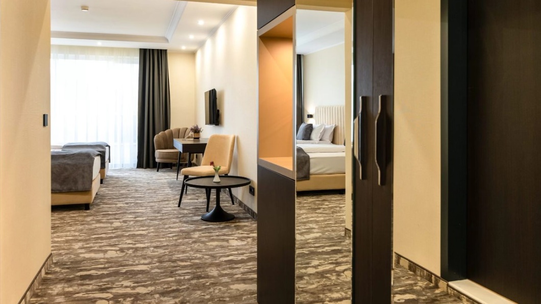 - обединени делукс стаи - 2 възрастни + 2 деца, 3 възрастни + 1 дете или 4 възрастни. Две свързани стаи с междинна врата между тях (спалня в едната, две единични легла в другата)