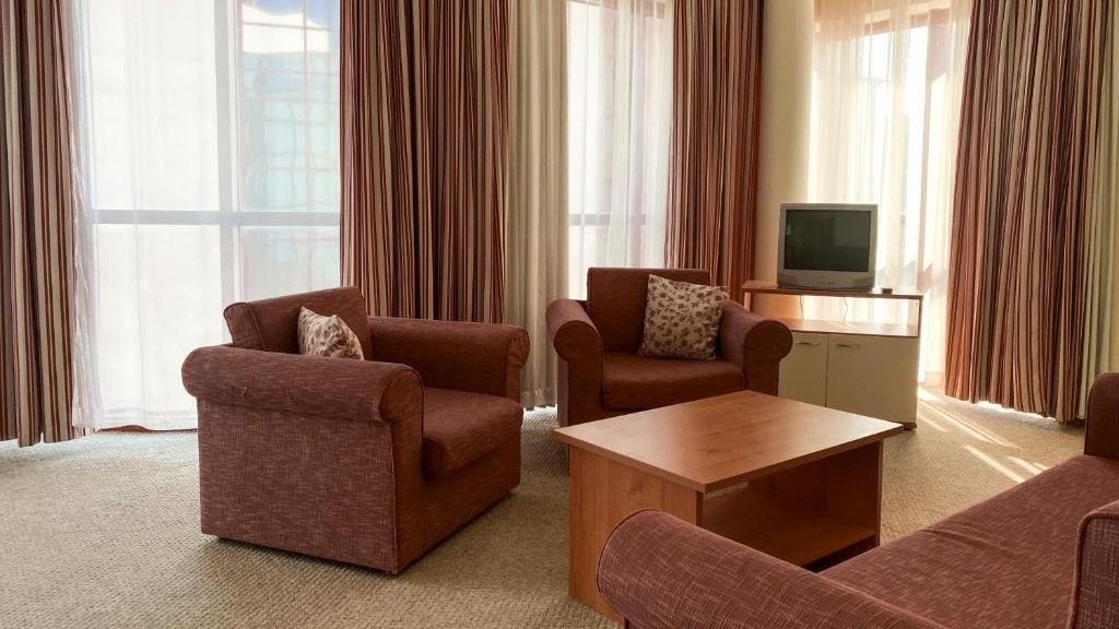 - Апартамент - площ 38 - 42 кв. м., разполага с голяма спалня и разтегателен диван, бюро, 25-инчов телевизор, телефон, минибар, кът за почивка, климатик, гардероб, условия за приготвяне на кафе и чай, халати и чехли, баня с вана и душ кабина, втора баня, сешоар, тераса
