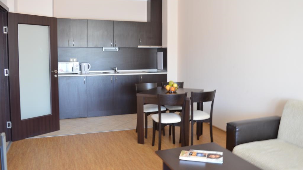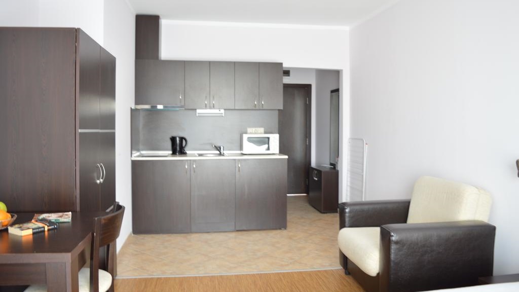 - студио - 2 възрастни + 1 дете до 14.99 год. Студиата (40 кв.м.) са обзаведени със спалня, разтегателен фотьойл (допълнително легло), кухненски бокс, кът за хранене с маса и столове, хладилник, керамични котлони, аспиратор, микровълнова фурна, мивка, телевизор;